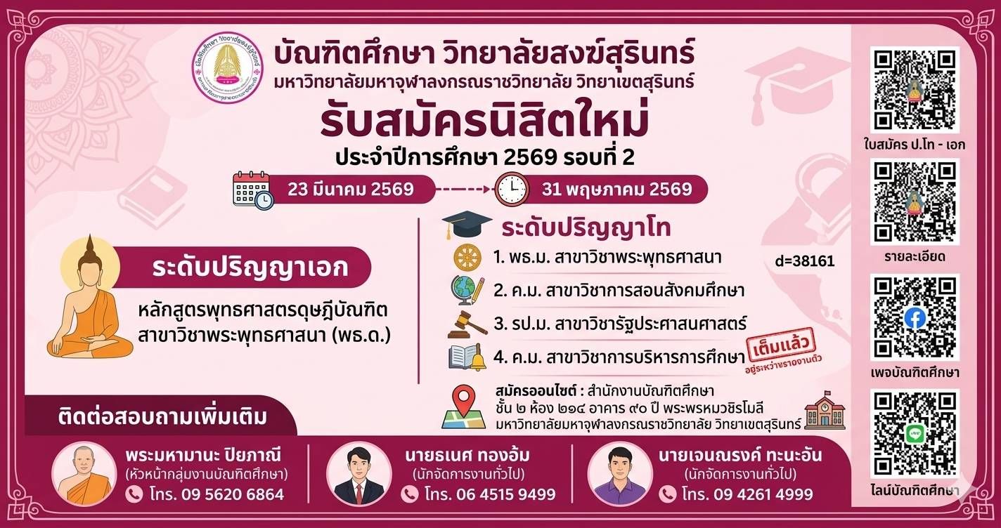 รับสมัครนิสิตใหม่ 2 5 6 9 ร อ บ ที่ 2 —————————————————— บัณฑิตศึกษา วิทยาลัยสงฆ์สุรินทร์ วิทยาเขตสุรินทร์ #เปิดรับสมัครนิสิตใหม่#รอบที่_2 ประจำปีการศึกษา_2569 ระดับดุษฎีบัณฑิต (ปริญญาเอก) หลักสูตรพุท